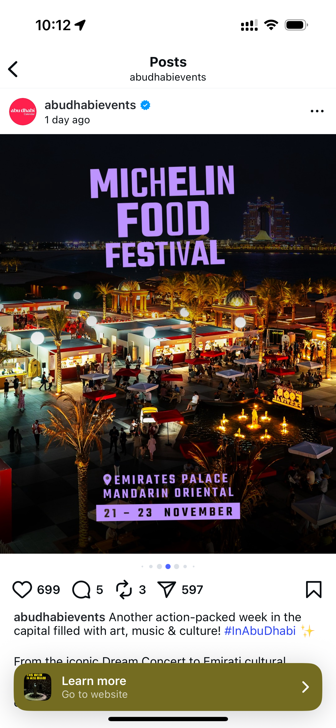 Michelin Food Festival at Emirates Palace Mandarin Oriental. Dates: 21–23 November in Abu Dhabi. From abudhabievents: Another action-packed week in the capital filled with art, music & culture! #InAbuDhabi